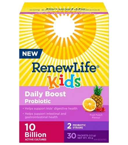 Renew Life Kids Daily Boost Probiotic delivers 10 billion active cultures and two clinically studied strains to support both digestive and respiratory health in children ages 3 to 12.